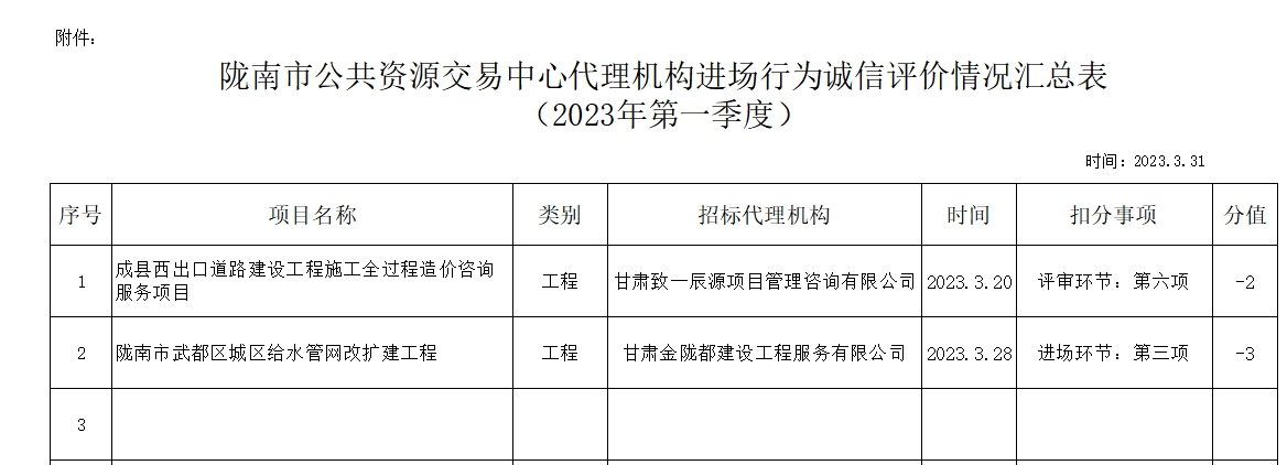 根據(jù)《甘肅省公共資源交易代理機構(gòu)管理辦法》(甘政辦發(fā)〔2019〕107號)和《隴南市公共資源交易中心代理機構(gòu)進場行為誠信評價實施制度(試行)》規(guī)定,現(xiàn)對2023年第一季度,共2家代理機構(gòu)2條進場行為誠信評價記錄予以通報(詳見附表)。請各代理機構(gòu)嚴(yán)格遵守各項規(guī)章制度、誠實守信,規(guī)范操作,為招標(biāo)人和采購人提供專業(yè)、高效、規(guī)范的招標(biāo)代理服務(wù)。