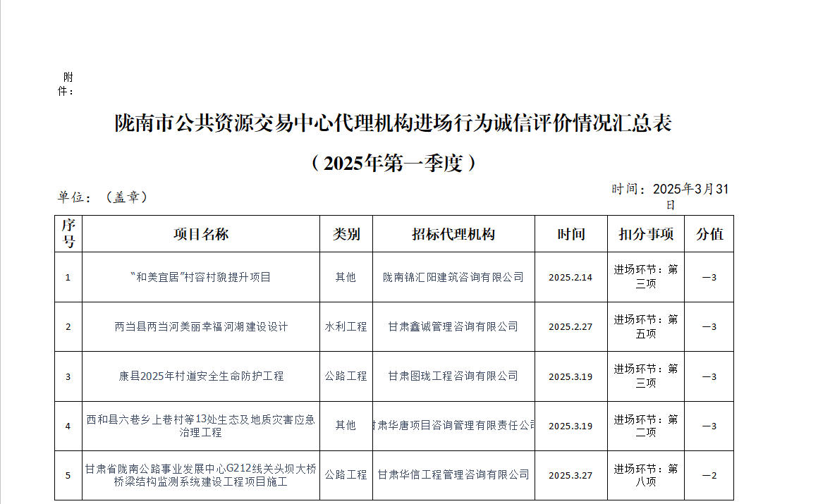 隴南市公共資源交易中心關(guān)于2025年第一季度代理機(jī)構(gòu)進(jìn)場(chǎng)行為誠信評(píng)價(jià)結(jié)果的公示