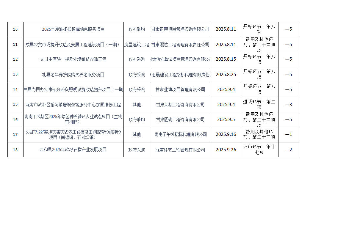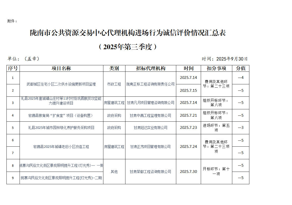 根據(jù)《隴南市公共資源交易中心代理機(jī)構(gòu)進(jìn)場(chǎng)行為誠(chéng)信評(píng)價(jià)實(shí)施制度(試行)》規(guī)定,現(xiàn)對(duì)2025年第三季度共15家代理機(jī)構(gòu)18條進(jìn)場(chǎng)行為誠(chéng)信評(píng)價(jià)記錄予以通報(bào)(詳見(jiàn)附表)。請(qǐng)各代理機(jī)構(gòu)嚴(yán)格遵守各項(xiàng)規(guī)章制度、誠(chéng)實(shí)守信,規(guī)范操作,為招標(biāo)人和采購(gòu)人提供專業(yè)、高效、規(guī)范的招標(biāo)代理服務(wù)。