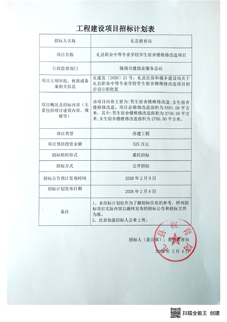 禮縣職業(yè)中等專業(yè)學(xué)校學(xué)生宿舍樓維修改造項(xiàng)目