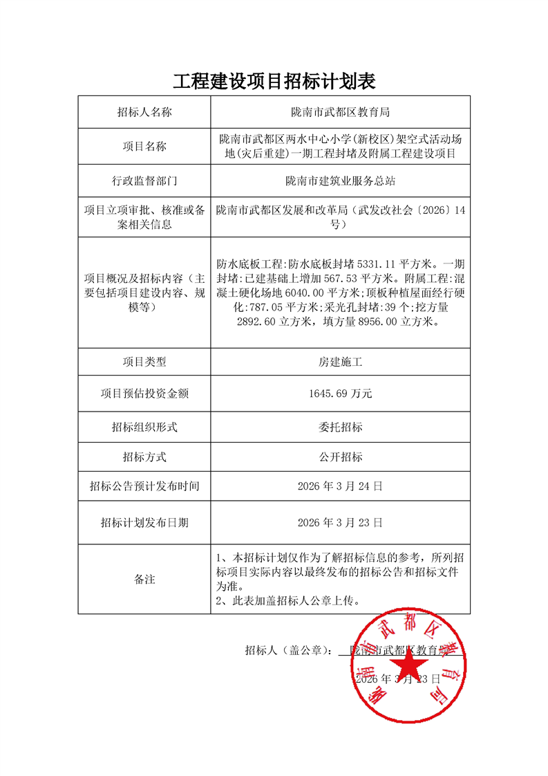 隴南市武都區(qū)兩水中心小學(xué)(新校區(qū))架空式活動(dòng)場(chǎng)地(災(zāi)后重建)一期工程封堵及附屬工程建設(shè)項(xiàng)目