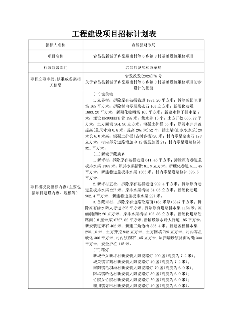 宕昌縣新城子鄉(xiāng)岳藏甫村等6鄉(xiāng)鎮(zhèn)8村基礎(chǔ)設(shè)施維修項(xiàng)目