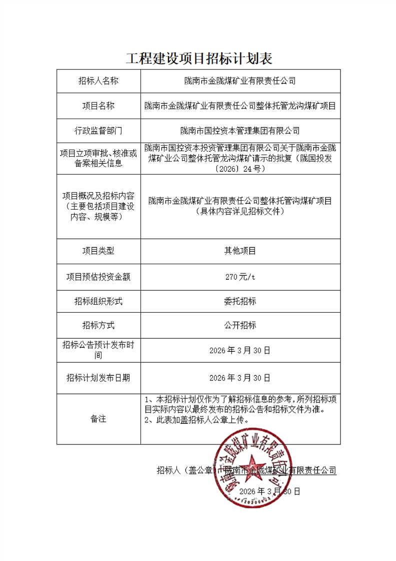 隴南市金隴煤礦業(yè)有限責(zé)任公司整體托管龍溝煤礦項目