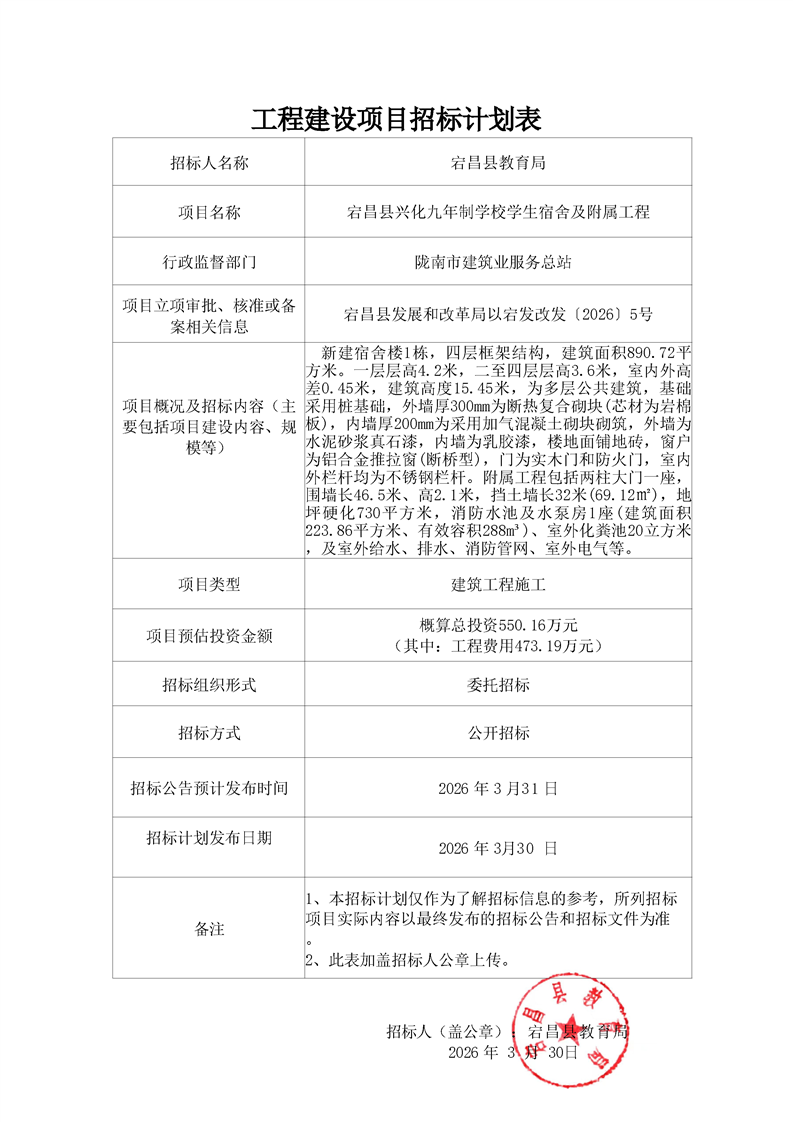 宕昌縣興化九年制學(xué)校學(xué)生宿舍及附屬工程