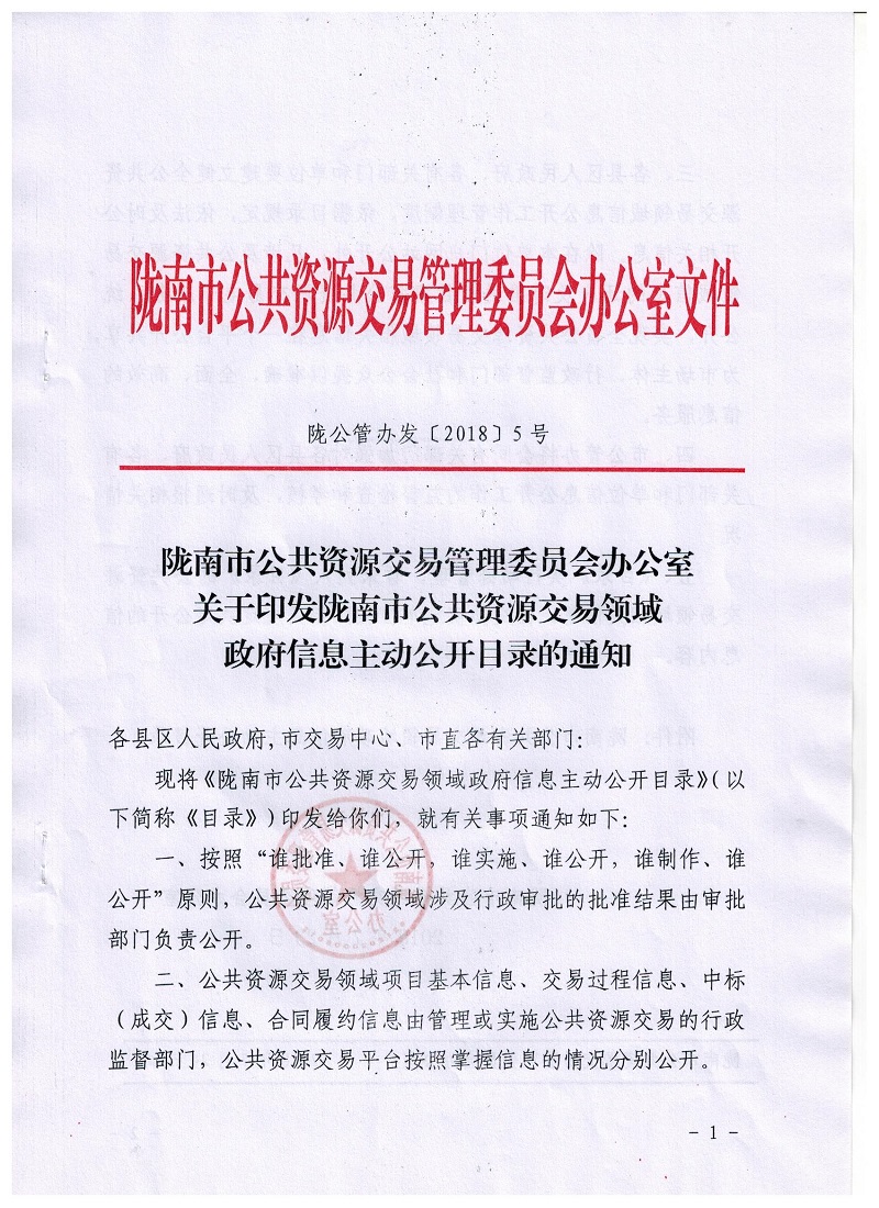 隴南市公共資源交易管理委員會辦公室關于印發(fā)隴南市公共資源交易領域政府信息主動公開目錄的通知